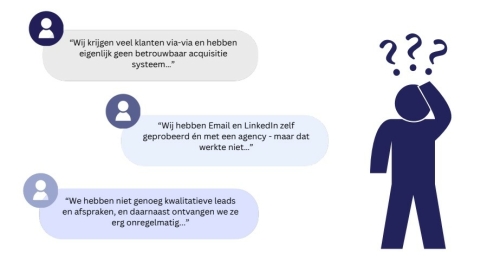 Als salesmanager of directeur weet je dat er meer groei in zit, maar acquisitie gebeurt alleen als iemand er bewust tijd voor maakt. Je product is sterk en klanten zijn tevreden, maar nieuwe omzet blijft achter. De pipeline leunt te veel op netwerk en referrals, waardoor groei onvoorspelbaar en lastig schaalbaar wordt.